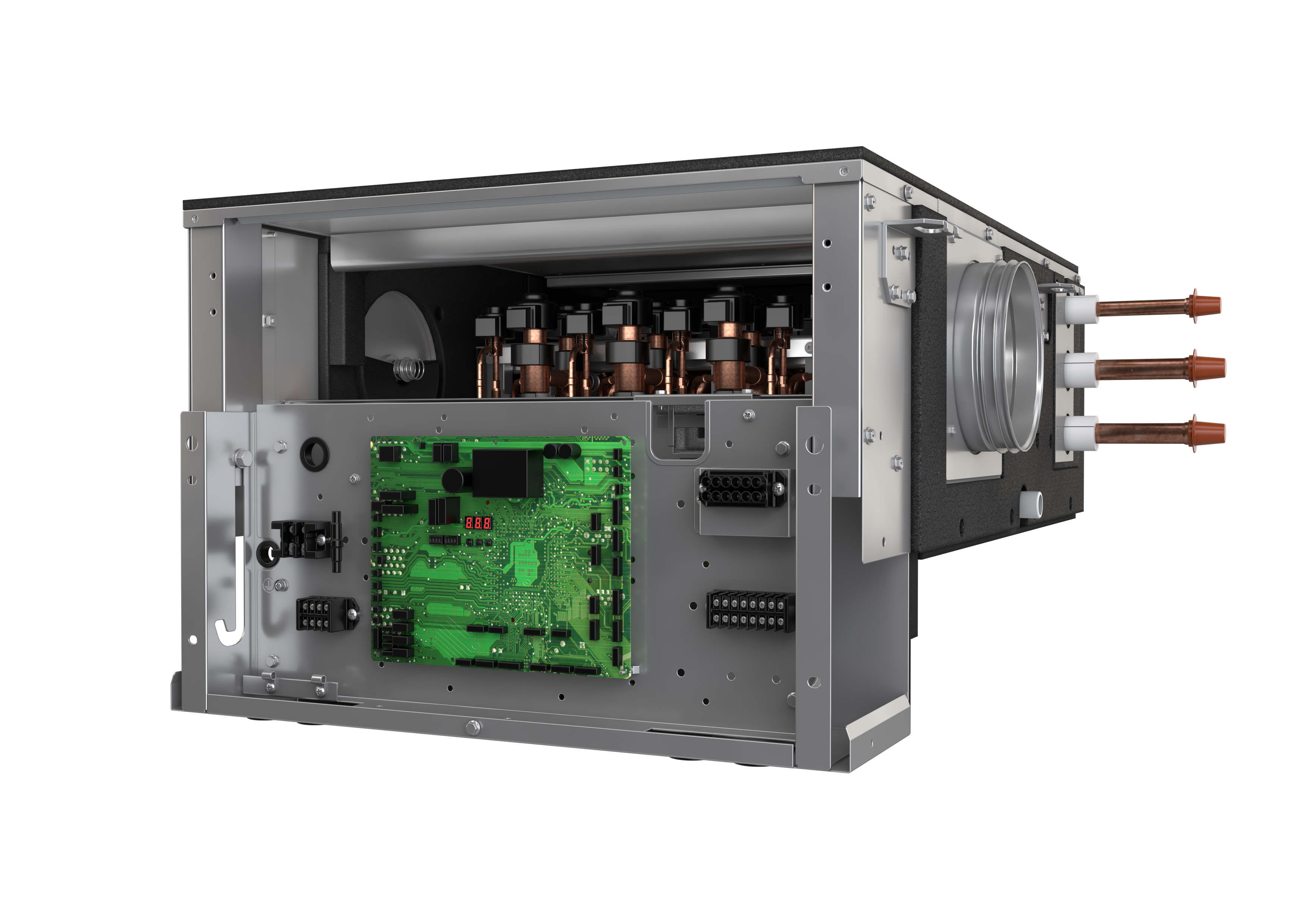 - Instalación más rápida gracias al flujo de refrigerante pasante que reduce el número de cobresoldaduras y de kits de juntas